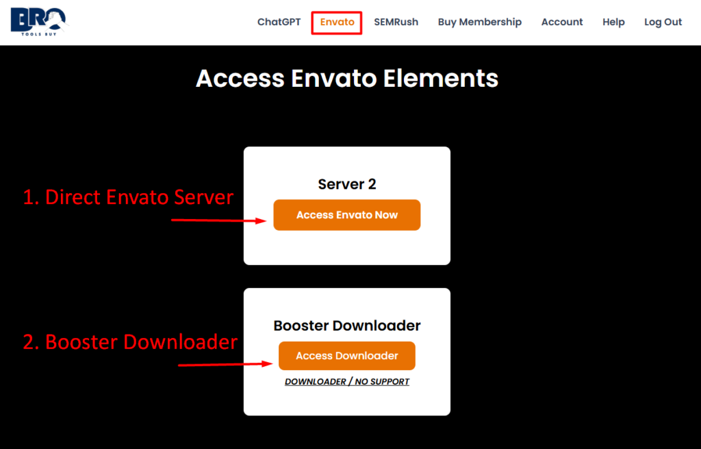 Main Server: Click “Access Envato” and it will auto-login to elements.envato.com in a new tab — no password needed.